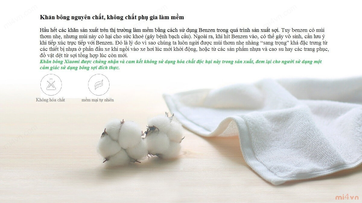 Khăn mặt bông nguyên chất Xiaomi ZSH, không chất phụ gia làm mềm. Hầu hết các khăn sản xuất trên thị trường làm mềm bằng cách sử dụng Benzen trong quá trình sản xuất sợi. Tuy benzen có mùi thơm nhẹ, nhưng mùi này có hại cho sức khoẻ (gây bệnh bạch cầu). Ngoài ra, khi hít Benzen vào, có thể gây vô sinh, cần lưu ý khi tiếp xúc trực tiếp với Benzen. Đó là lý do vì sao chúng ta luôn ngửi được mùi thơm nhẹ nhàng “sang trọng” khá đặc trưng từ các thiết bị nhựa ở phần đầu xe khi ngồi vào xe hơi lúc mới khởi động, hoặc từ các sản phẩm nhựa và cao su hay các trang phục, đồ vật dệt từ sợi tổng hợp lúc còn mới. Khăn mặt bông nguyên chất Xiaomi ZSH được chứng nhận và cam kết không sử dụng hóa chất độc hại này trong sản xuất, đem lại cho người sử dụng một cảm giác sử dụng bông sợi đích thực.