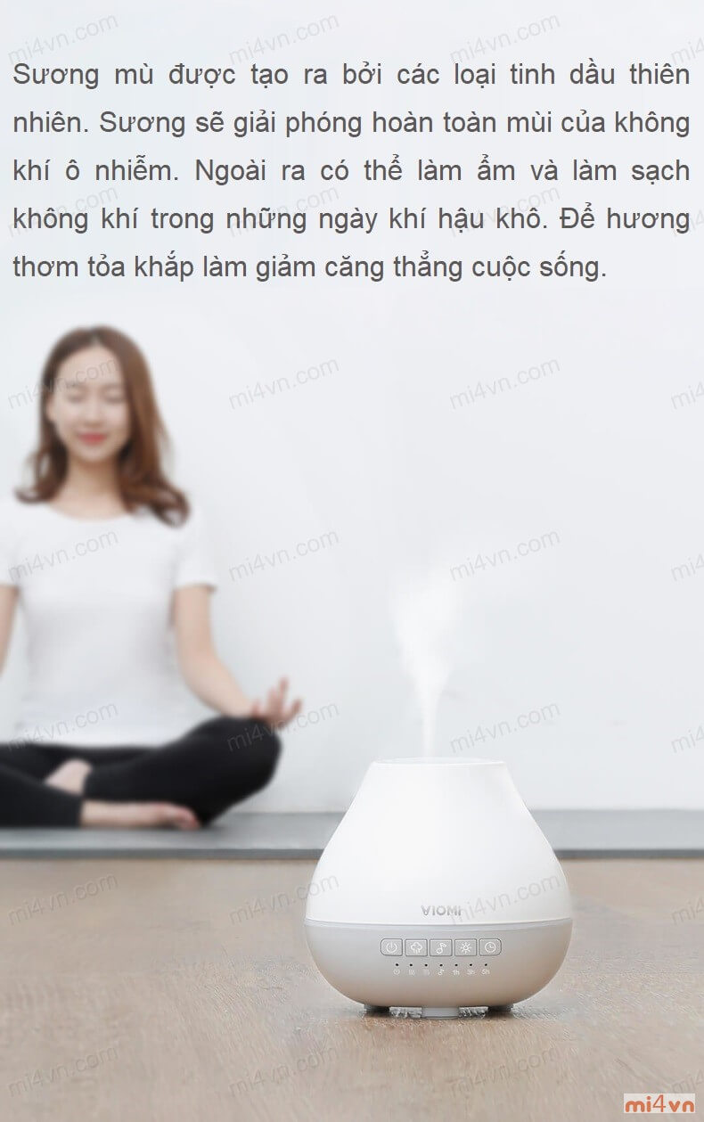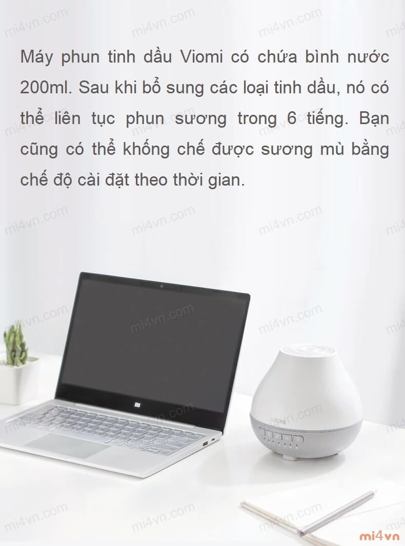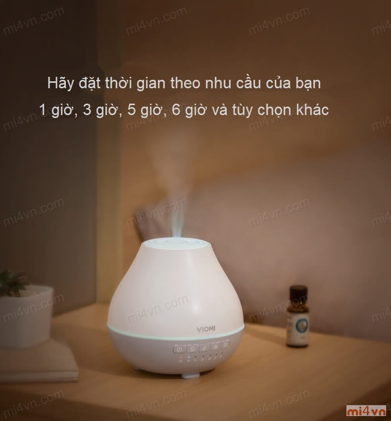 Máy phun tinh dầu Viomi có chứa bình nước 200ml. Sau khi bổ sungcác loại tinh dầu, nó có thể liên tục phun sương trong 6 tiếng. Bạn cũng có thểkhống chế được sương mù bằng chế độ cài đặt theo thời gian.