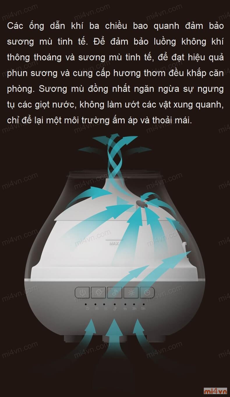 Để đảm bảo luồng không khí thông thoáng và sương mù tinh tế, đểđạthiểu quả phu sương và cung cấp hương thơm đều khắp căn phòng. Sương mù đồngnhất ngăn ngừa sự ngưng tụ các giọt nước, không làm ướt các vật xung quanh, chỉđể lại một môi trường ấm áp và thoải mái. Sương mù được tạo ra bởi các loại tinh dầu thiên nhiên. Sương sẽgiải phóng hoàn toàn mùi của không khí ô nhiễm. Ngoài ra có thể làm ẩm và làm sạchkhông khí trong những ngày khí hậu khô. Để hương thơm tỏa khắp làm giảm căng thẳng cuộc sống.